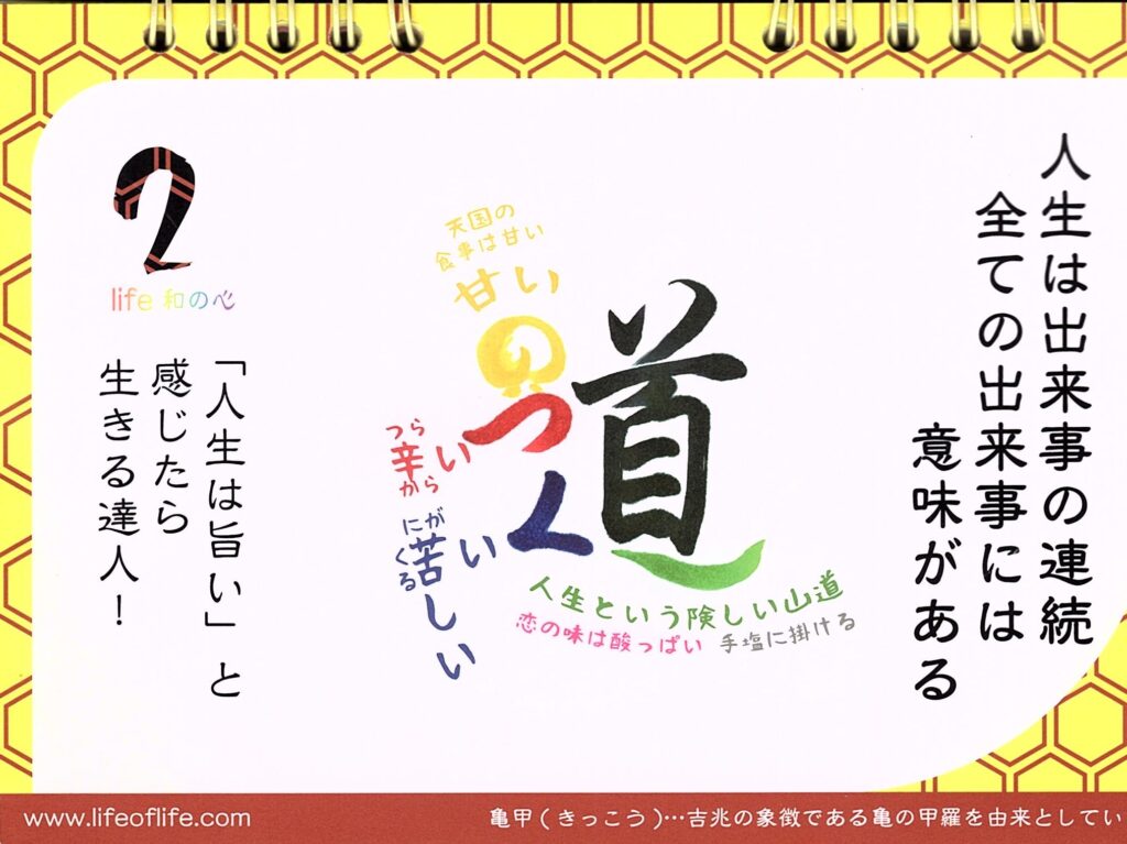 未分類 全ての出来事には意味がある! 2026年4月2日 / 「人生は旨い」と感じたら生きる達人! 道という字をひも解くと・・・ 自分という修行僧が「自」傘をかぶって人生の荒波・険しい道を歩むということです。 その先には苦しい時や辛い時もあります。 しかし、辿り着くのは天寿全うした満足感や達成感の甘い香りの世界です。 人生に問いかけられた、お題に向き合い 前を向いて歩めばやがて辿り着くことができます。 日々起こる出来事に意味を持ち成功・成幸に向かって人生を楽しみましょう!